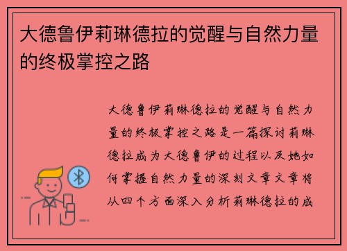 大德鲁伊莉琳德拉的觉醒与自然力量的终极掌控之路