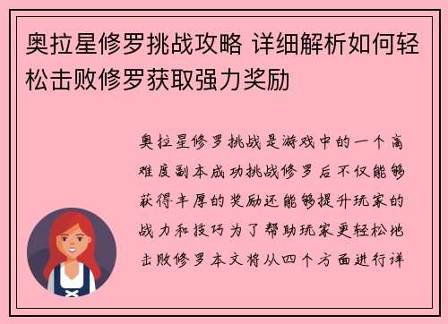 奥拉星修罗挑战攻略 详细解析如何轻松击败修罗获取强力奖励