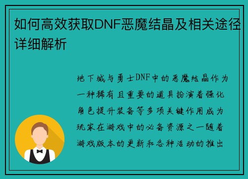 如何高效获取DNF恶魔结晶及相关途径详细解析