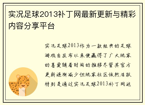实况足球2013补丁网最新更新与精彩内容分享平台